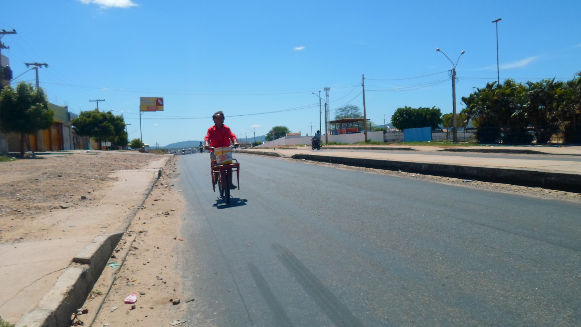 Na via duplicada inacabada e mal projetada de Afogados, um ciclista solitário pedala sua bike de ‘vermeio’, conduzindo um balde vazio de margarina chei nun sei de quê?