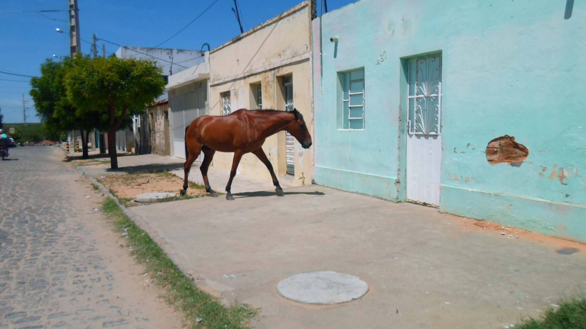Mais pra riba, um quadrúpede sob uma calçada segue em direção a porta de uma residência. Antes de butar a venta na porta, o danado de um menino tacou-lhe um cipó nos lombos.